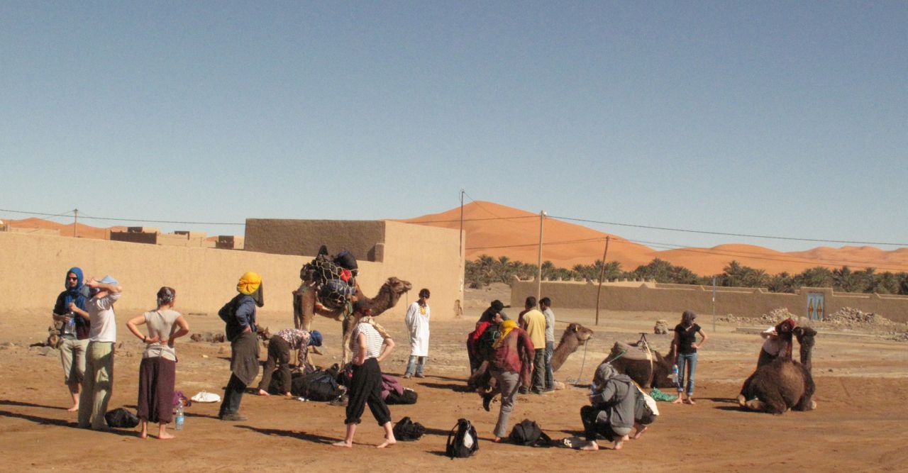 I was waiting to depart on a retreat into the Sahara. We were assembling at an oasis village on the edge of the dunes and going the rest of the way on foot, while the camels were carrying our baggage. Life happens slowly in the desert. Events don’t really happen at all. The next thing comes when it comes. And sometime that morning the camels were going to arrive, so, nothing to do except wait. After a couple of hours they plodded into view from behind a collection of mud-brick buildings which were between us and the dunes, stood looking lazily into the distance for a while, and in the end lay down haphazardly on the empty space in front of us. Sometime later in the morning they were loaded, an operation to which they paid no attention at all; and sometime later still, they were bidden to rise, which they did, in their own time, back legs first, looking unfazed by the fact that their centre of gravity went quite awry in the process. Then people and camels stood around for a while seeming to consider what might come next, until, without any apparent signal, our disordered caravan moved off.